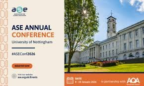 The ASE is delighted to be hosting its Annual Conference at the University of Nottingham from 8th to 10th January 2026. The three days include over 220 sessions with keynotes, speakers and workshops offering a broad scope of professional development, along with a fantastic exhibition of publishers, exam boards, organisations and resource suppliers, as well as social events and more. Our thanks are extended to AQA for being our main Conference Partner and also to Educake Ltd for sponsoring the 11-19 programme.