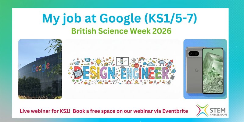 Meet a STEM Ambassador who is an industrial design engineer at Google, to find out about their job and ask your questions!In this free 30-minute webinar, you and your KS1 class will have the opportunity to meet a STEM Ambassador who works at Google and hear all about her job! After the STEM Ambassador has presented, participating classes can put questions to them for the remaining time. These will be submitted via the webinar chat function and the host will then pick a selection to be asked.This session will be run over Microsoft Teams. There will be multiple schools on the call so cameras and microphones will be disabled for all classes. The Teams link to join this webinar will be sent in the confirmation email, and then again 24 hours and 30 minutes before the webinar. to book places please go here